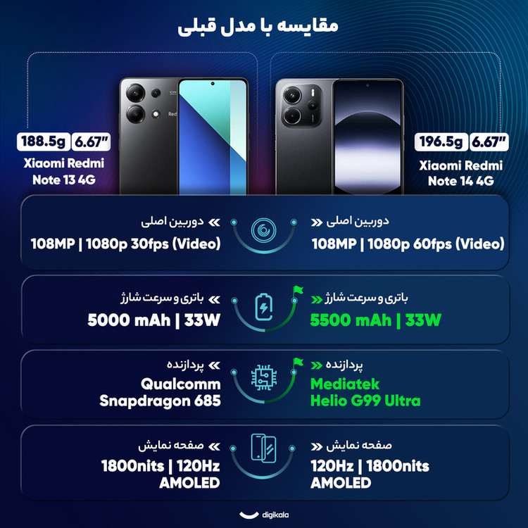 شیائومی Redmi Note 14 4G یکی از جدیدترین گوشیهای سری نوت شیائومی است که همواره از پرفروشترین سریهای شیائومی بودهاند. این موبایل که در ژانویه 2025 معرفی شد، با ابعاد 163.3x76.6x8.2 میلیمتر و وزن 196.5 گرم طراحیای زیبا و ارگونومیکی دارد. از طرفی با مقاومت در برابر پاشش آب و گرد و غبار و داشتن استاندارد IP54 در شرایط مختلف دوام و پایداری بیشتری ارائه میدهد. صفحه نمایش 6.67 اینچی AMOLED با نرخ بروزرسانی 120 هرتز و روشنایی 1800 نیت، نمایش تصاویری زنده و شفاف را تضمین میکند. فناوری Always-on Display تجربهای منحصربهفرد در مشاهده محتوا فراهم میکند. محافظ Corning Gorilla Glass 5 نیز صفحه نمایش را در برابر خط و خش محافظت میکند. پردازنده بهینه Mediatek Helio G99 Ultra با معماری 6 نانومتری، در کنار پردازنده گرافیکی Mali-G57 MC2، عملکردی روان و بینقص در اجرای اپلیکیشنها و بازیهای نیمه سنگین ارائه میدهد. باتری 5500 میلیآمپرساعتی با قابلیت شارژ سریع 33 وات نیز استفاده طولانی مدت و شارژ سریع را تضمین میکند. دوربین اصلی 108 مگاپیکسلی با لنز عریض و فناوری فوکوس PDAF، تصاویری شفاف و حرفهای ثبت میکند. دوربین ماکرو 2 مگاپیکسلی تجربهای جذاب برای عکاسی از جزئیات فراهم میکند. دوربین سلفی 20 مگاپیکسلی برای عکسهای شخصی و تماسهای تصویری بسیار مناسب است. در پایان، ردمی نوت 14 4G با سیستمعامل Android 14، بلوتوث 5.3، و حسگر اثرانگشت زیر صفحه نمایش، Redmi Note 14 4G مجموعهای از طراحی زیبا، عملکرد قدرتمند و امکانات متنوع را ارائه میدهد که نیازهای کاربران را بهخوبی برآورده خواهد کرد.
