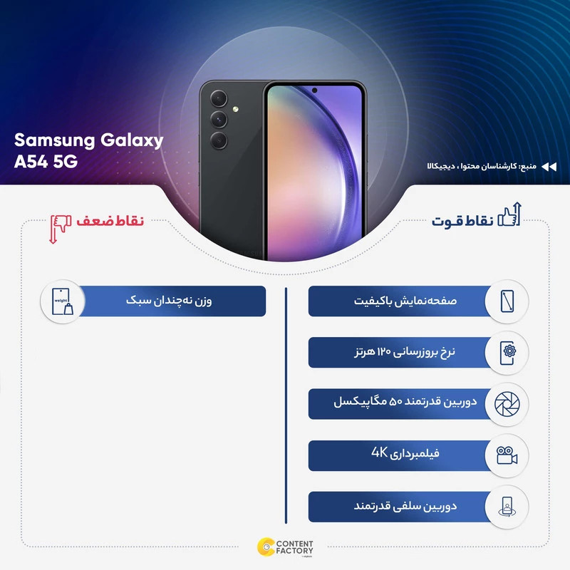 با هر سلیقه و توقعی از گوشیهای هوشمند میانرده، باید بدانید که گوشیهای میانرده سری A شرکت سامسونگ، میتوانند نیاز شما را برآورده کنند. سامسونگ Galaxy A54 5G هم با توجه به مشخصات فنی در نظر گرفته شده و البته قیمتی مقرون بهصرفه، ارزش خرید بالایی دارد. صفحهنمایش باکیفیت 6.4 اینچی این گوشی با رزولوشن بسیار خوب و حداکثر روشنایی 1000 نیت، در شرایط نوری متنوع و حتی زیر تابش مشتقیم نور خورشید هم، وضوح تصویر بسیار خوبی را ارائه میکند. حضور سنسور قدرتمند عریض (اصلی) برای ثبت تصاویر بسیار جذاب در نور روز و نور شب، سنسور دوربین فوق عریض 12 مگاپیکسل با زاویه دید گسترده 123 درجه که مناسب عکاسی در طبیعت است و همچنین سنسور 5 مگاپیکسل ماکرو برای ثبت تصاویر از فاصله نزدیک، بهخوبی تمام نیازهای شما را در عکاسی و حتی فیلمبرداری، فراتر از یک گوشی میانرده برآورده میکنند. پردازنده اگزینوس 1380 این گوشی هم سوالی عملکرد بسیار خوب در اجرای بازیهای حتی سنگین، سبب شده تا این گوشی توانایی پشتیبانی از شبکههای اینترنتی پرسرعت 5G را هم داشته باشد. در نهایت باتری 5000 میلیآمپرساعت هم به ازای هر بار شارژ صد درصدی، در شرایط استفاده معمولی، طول عمر مفید (زمان آماده بهکار) دو روز را ارائه میکند. همانطور که میدانید، درون جعبه این گوشی خبری از آداپتور شارژر نیست، اما این گوشی بههمراه شارژر 25 وات سامسونگ به فروش میرسد که رنگ شارژر ارسالی ممکن است سفید یا مشکی باشد.