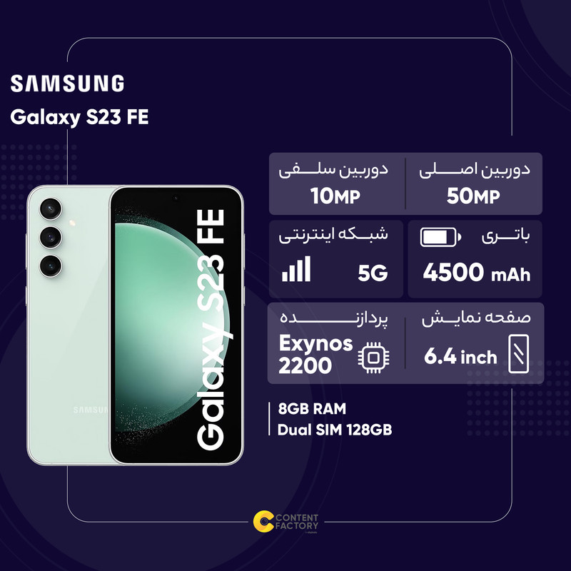 سامسونگ چند سالی است که در کنار رونمایی از پرچمداران قدرتمند خود، گوشی مقرون بهصرفه با مشخصات نزدیک به پرچمداران را معرفی میکند که گوشی موبایل سامسونگ مدل Galaxy S23 FE یکی از آنها است. ظاهر این گوشی ما را به یاد Galaxy S23 و Galaxy S23 Plus میاندازد و از نظر مشخصات فنی در نظر گرفته شده در برخی از بخشها، چیزی کم از آنها ندارد. در نمای روبهرویی این گوشی به صفحهنمایش با ابعاد 6.4 اینچ و رزولوشن 1080×2340 پیکسل از نوع Dynamic AMOLED 2X مجهز شده که توانایی نمایش 403 پیکسل در هر اینچ را دارد. این مشخصات در کنار نرخ بروزرسانی 120 هرتز و حداکثر روشنایی 1450 نیت (nits) سبب شده تا عملکردی بسیار باکیفیت در حد و اندازه گوشیهای پرچمدار را شاهد باشید. در قسمت پشتی هم یک سنسور دوربین اصلی با رزولوشن 50 مگاپیکسل در کنار سنسور 8 مگاپیکسل تلهفوتو با قابلیت زوم سه برابری اپتیکال (زوم بدون کم شدن کیفیت) و سنسور 12 مگاپیکسل از نوع فوقعریض (ultrawide) در نظر گرفته شده است. قابلیت فیلمبرداری با نهایت کیفیت 8K در کنار سنسورهای دوربین در نظر گرفته شده، نشان از آن دارد که میتوانید با خیال راحت در زمینه عکاسی و فیلمبرداری روی این گوشی هوشمند حساب باز کنید. دوربین سلفی با رزولوشن 10 هم در عکاسی و فیلمبرداری، توقعات شما را بهخوبی هرچه تمامتر برآورده میکند. در بخش مشخصات سختافزاری هم این گوشی به پردازنده اختصاصی اگزینوس 2200 سامسونگ مجهز شده و میتوانیم بگوییم که با حضور این پردازنده، سامسونگ Galaxy S23 FE بهراحتی از پس اجرای بازیهای سنگین و برنامههای کاربردی برمیآید. باتری 4500 میلیآمپرساعت در کنار پشتیبانی از فناوری شارژ سریع 25 وات، از دیگر مشخصات در نظر گرفته شده هستند. در مجموع باید بگوییم که اگر به دنبال خرید گوشی هستید که به نسبت پرچمداران قیمتی ارزانتر داشته باشد و از مشخصاتی در حد و اندازه پرچمداران بهره برده باشد، سامسونگ Galaxy S23 FE میتواند انتخاب بسیار مناسبی برای شما باشد. همانطور که میدانید، درون جعبه این گوشی خبری از آداپتور شارژر نیست، اما این گوشی بههمراه شارژر 25 وات سامسونگ به فروش میرسد که رنگ شارژر ارسالی ممکن است سفید یا مشکی باشد.